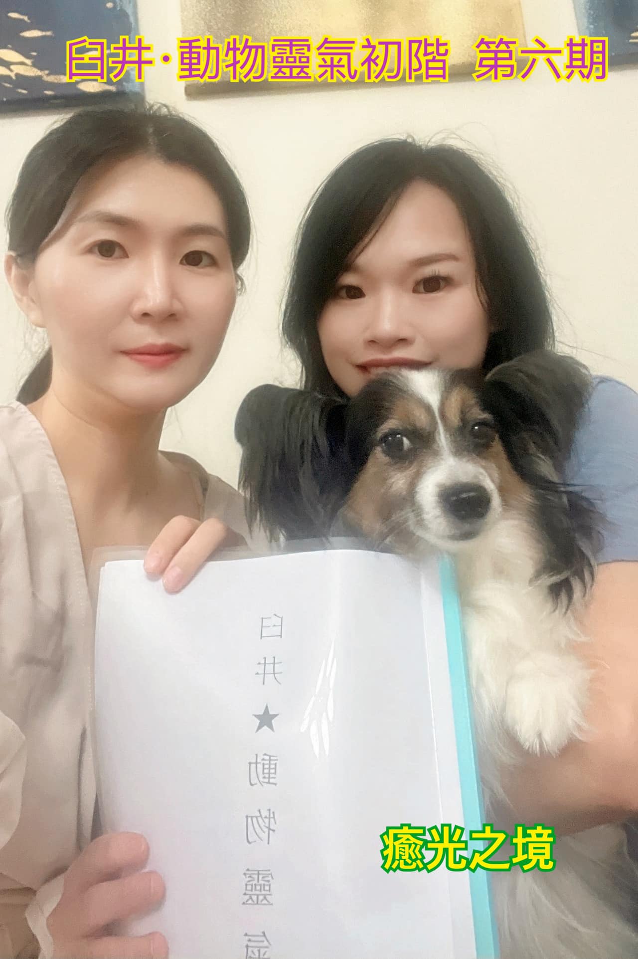 除了練習自我療癒外,剛好狗也在旁邊,也教她如何幫小狗做療癒,她的感知力也是很ok的!